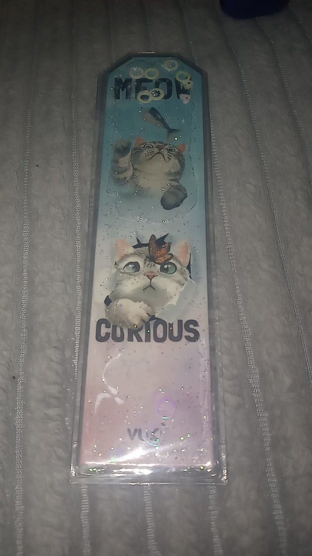 Pastel tonlarda, üzerinde "CURIOUS" yazısı ve sevimli kedi çizimleri bulunan çok renkli kedi aksesuarı.