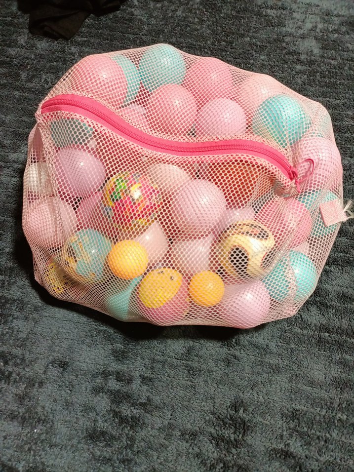 Pastel renklerde oyun toplarından oluşan set, pembe file torba içinde, yumuşak ve hafif tonlarda, birkaç desenli top da bulunur.