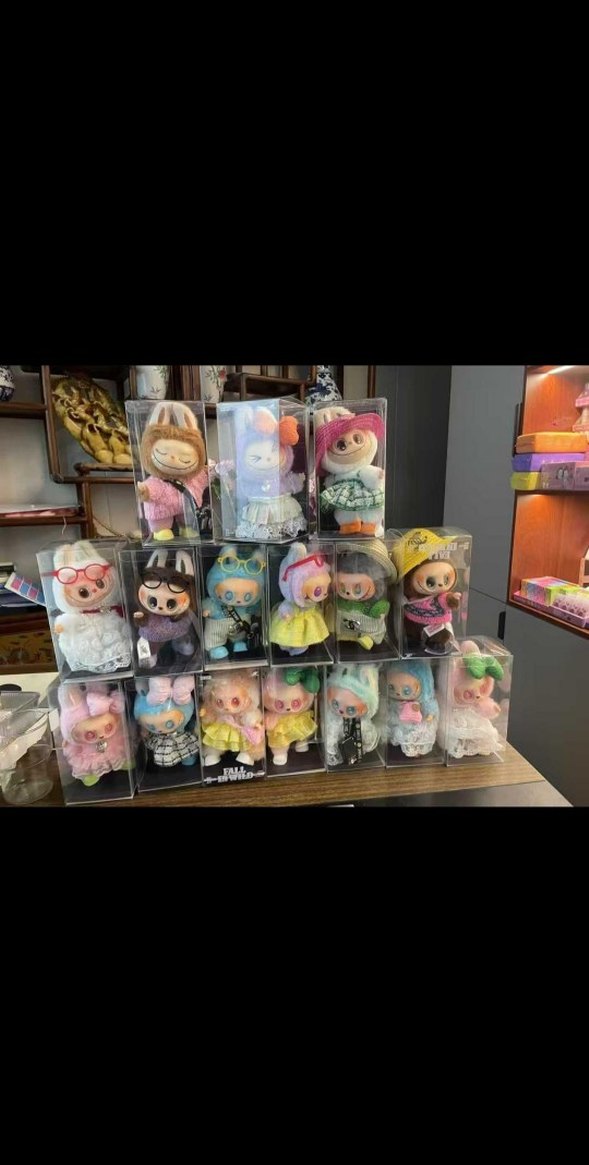 Çeşitli tarz ve kıyafetlerde, şeffaf kutularda sunulan yumuşak pastel renkli peluş oyuncaklar. Çok renkli ve sevimli tasarımlar.