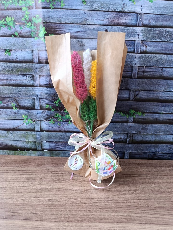 Pastel renklerde örülmüş çiçeklerin kahverengi kağıda sarıldığı, kurdele ve etiketlerle süslenmiş buket. Öğretmenler günü hediyesi