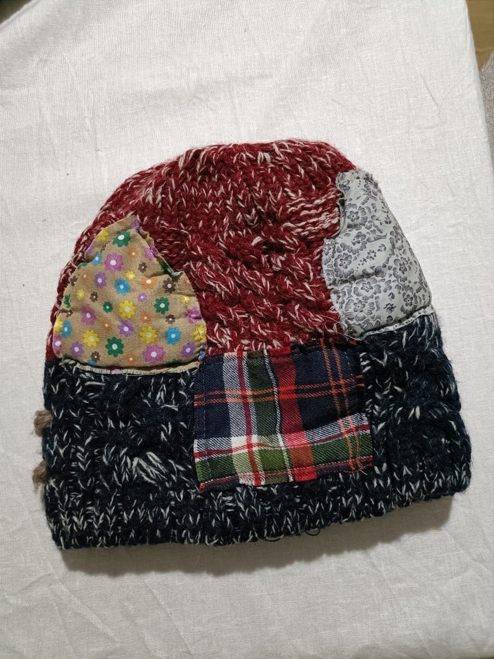 Kadın bere, renkli patchwork desenleri ve koyu tonlarıyla örgü yapıda, rahat ve bohem tarz sunar.