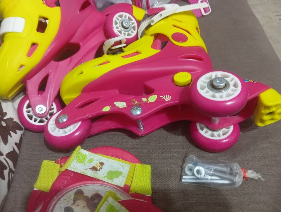 Çocuklar için ayarlanabilir kayışlı, pembe ve sarı renkli patenler ve ekstra aksesuarlar. koca ayı ve maşa karakterli orjinal ayarlanabilir 24ten 32cmkadar.