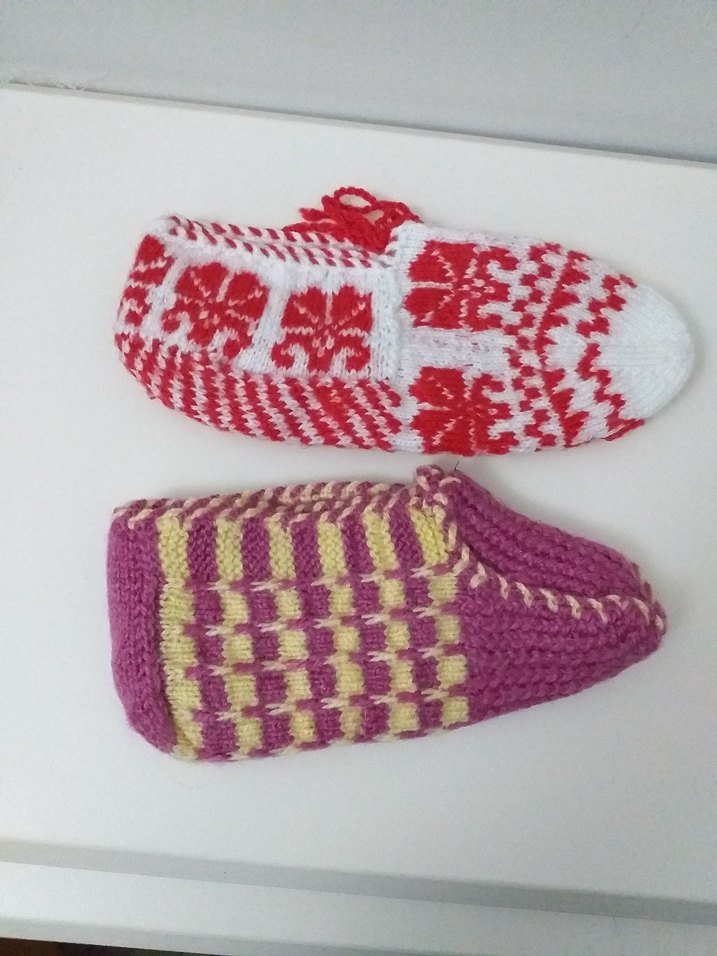 Renkli işlemeli desenlere sahip örgü kadın patikleri.