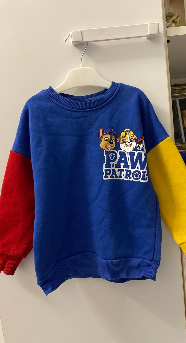 Renkli Paw Patrol baskılı, kürklü detaylı erkek sweatshirt. Kırmızı ve sarı uzun kollu, mavi yuvarlak yaka ve bol kesimdir.