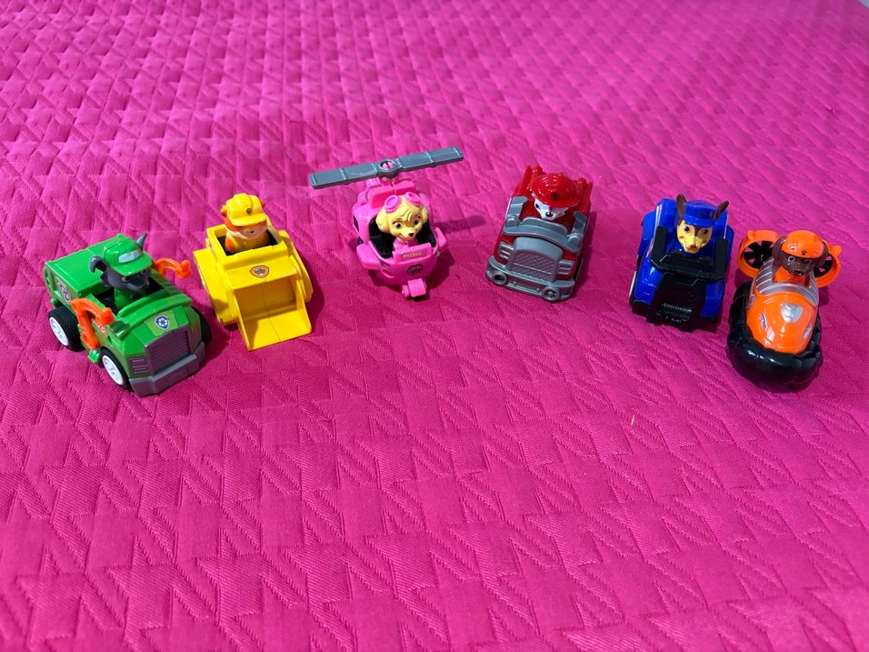 Sarı kepçe, pembe helikopter, kırmızı itfaiye aracı ve mavi araç içeren renkli Paw Patrol figür oyuncakları. Hayal gücünü destekler.