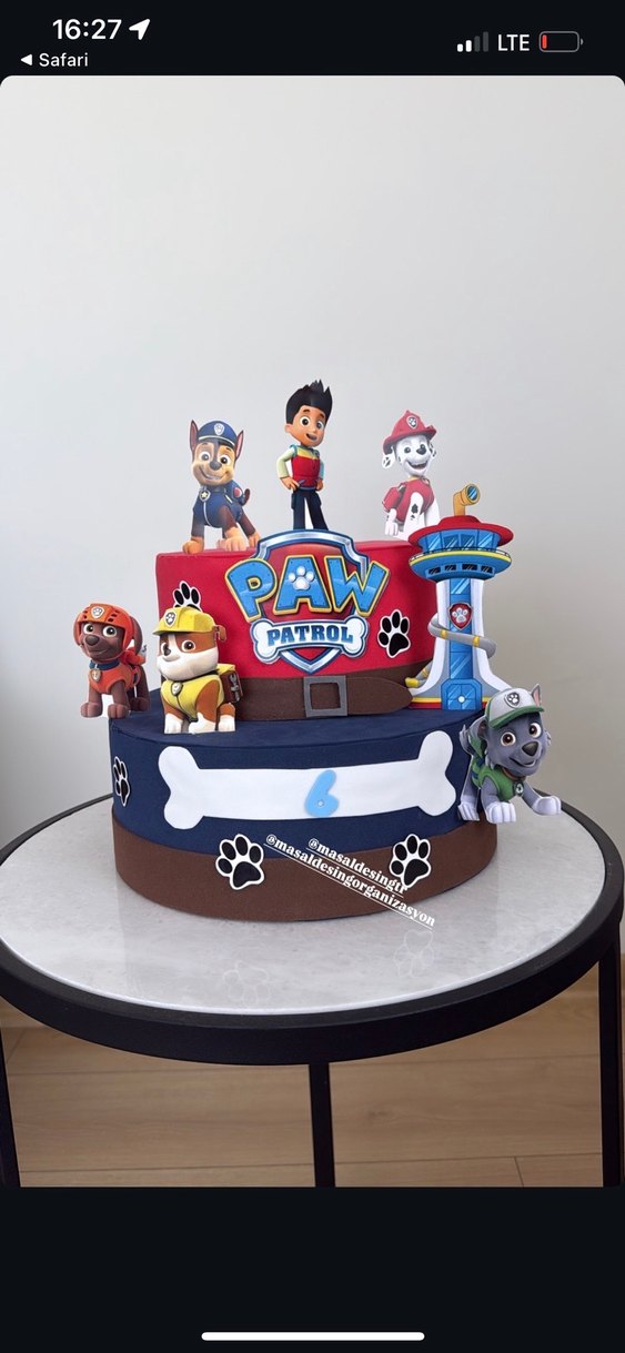 Renkli Paw Patrol figürleri ve temalı süslemelerle dekore edilmiş pasta, kemik ve pati izleri detayları içerir. tüm konseplere özel maket pastalar yapılır. paw petrol doğum günü konseptimize uygun pastamız satılık 500 kiralık 300 tl’dir. pendikteyiz