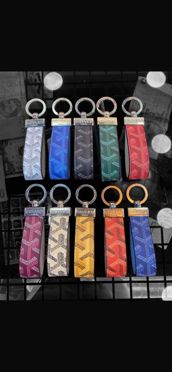 Payetli detaylara ve GOYARD logosuna sahip renkli sokak modası anahtarlıkları, trend belirleyiciler için avant-garde tarzda.