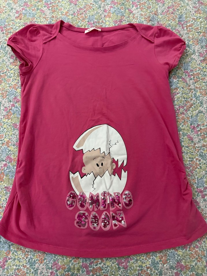 Pembe hamile tişörtü, kısa kollu ve yuvarlak yakalıdır. Pamuklu, bol kesim ve payetli renkli baskıya sahiptir. "COMING SOON" yazısı ile parti için uygun. Kısa bir süre kullanıldı,tertemizdir,herhangi bir defosu yoktur,gönül rahatlığıyla kullanabilirsiniz