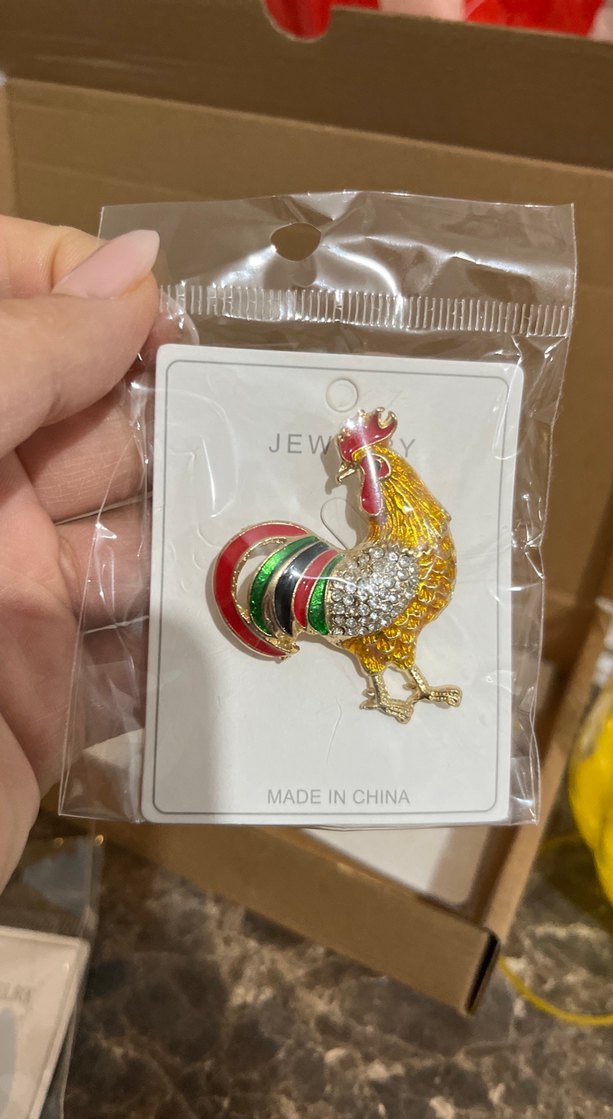 Payet ve kristallerle süslenmiş, bohem etnik tarzda renkli horoz broş. Üzerinde 'JE, MADE IN CHINA' yazısı bulunur.