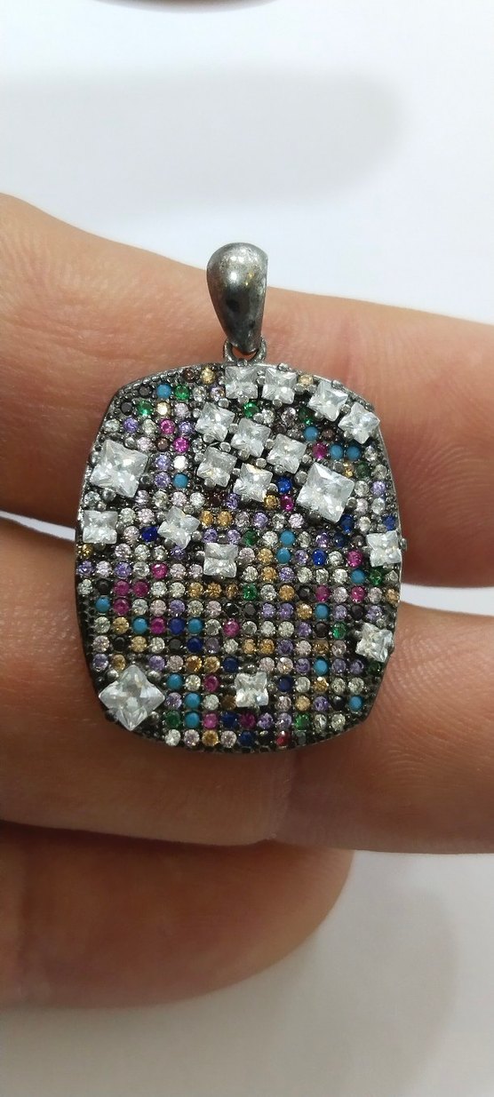Kadınlar için koyu renkli, çok renkli desenli ve payetli detaylara sahip kolye ucu. Bohem ve göz alıcı tarzıyla günlük kullanıma uygundur. ✨ 1️⃣925 AYAR GÜMÜŞ 2️⃣ AĞIRLIK:5.003️⃣SIFIR ÜRÜN4️⃣GARANTİ SERTİFİKASI