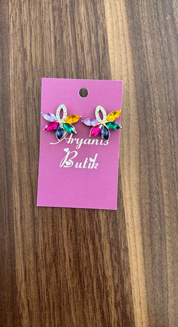 Kısa uzunlukta, renkli desenli ve payet detaylı bohem stilde minimalist küpeler. Marka: Aryanis Butik.