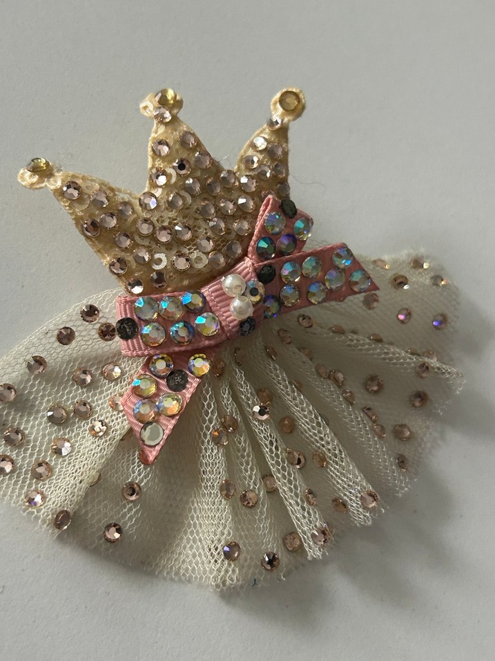 Payetli taç ve fiyonk detaylı, nakışlı, renkli broş. File kumaş ile bohem ve şık bir görünüm sağlar.