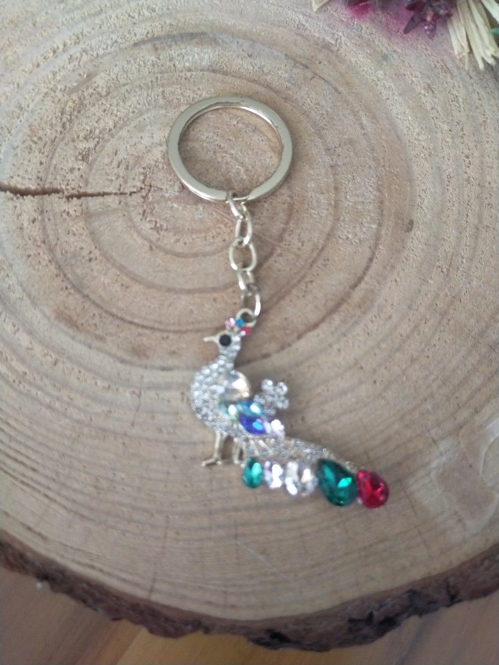 Renkli taşlı ve payetli tavuskuşu tasarımlı, bohem ve gösterişli tarzda anahtarlık.