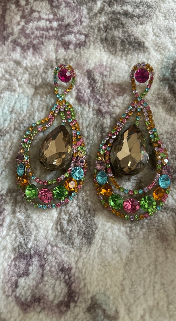 Uzun, renkli ve payetli desenlere sahip bohem tarzda küpeler, gösterişli bir düğün görünümü için uygundur. ✨