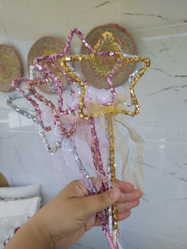 Payetlerle süslenmiş renkli yıldız şeklinde sihirli asa değnekler, ince kurdele detaylarıyla ✨tek asa fiyatıdır.
