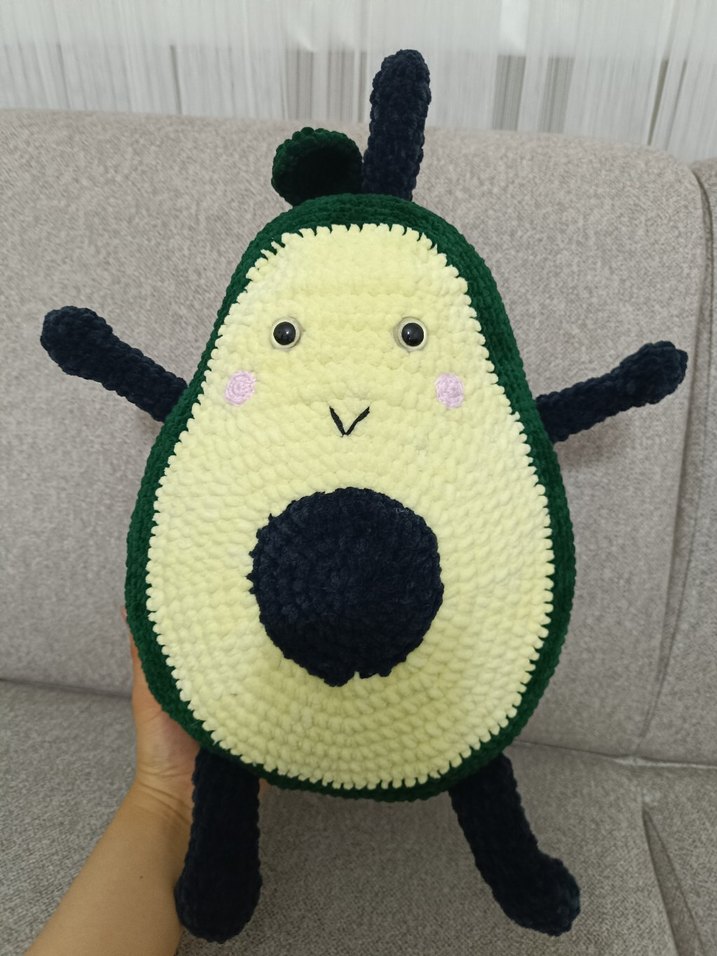 Yumuşak ve renkli peluş avokado oyuncak, sevimli yüzü ve dokulu kumaşıyla dikkat çeker.