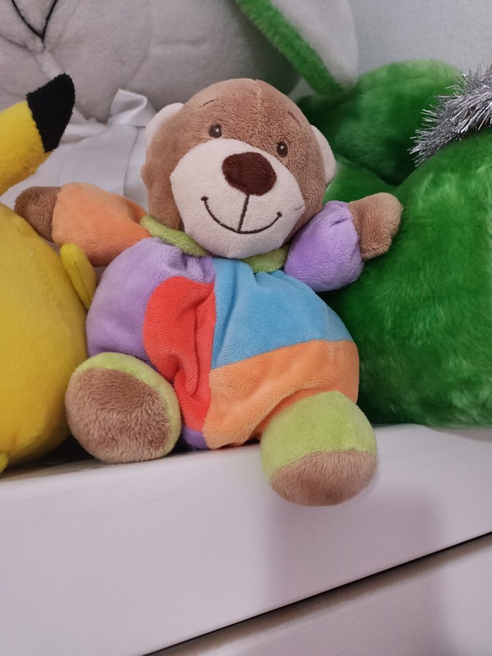 Yumuşak kumaştan yapılmış, renkli ve gülümseyen peluş ayıcık oyuncak. Sarılmak ve oynamak için uygun. yeni gibi