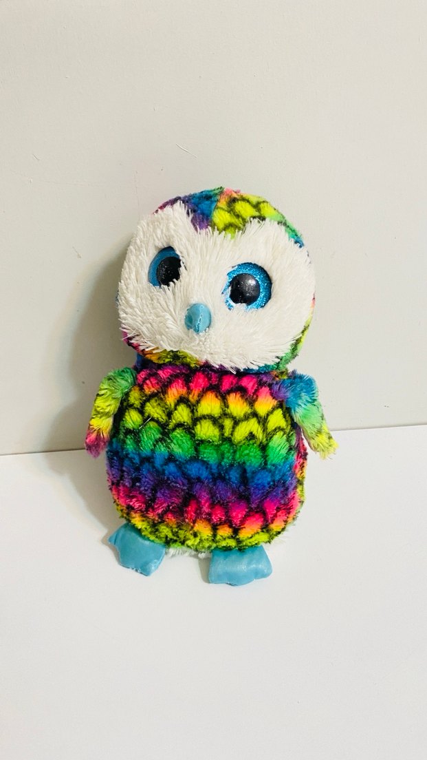 Yumuşak, canlı renkli kumaştan yapılmış, mavi gözlü ve ayaklı peluş baykuş oyuncak.