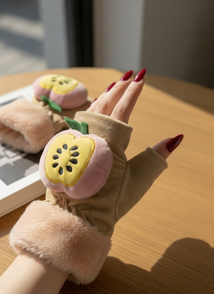 Yumuşak ve sıcak kumaştan yapılmış, renkli meyve şeklinde peluş detaylara sahip bej parmaksız eldivenler, rahat ve şık bir görünüme sahiptir. Yalnızca 2 kere kullandım hiçbir sorunu ve deformesi yoktur , yenidir.