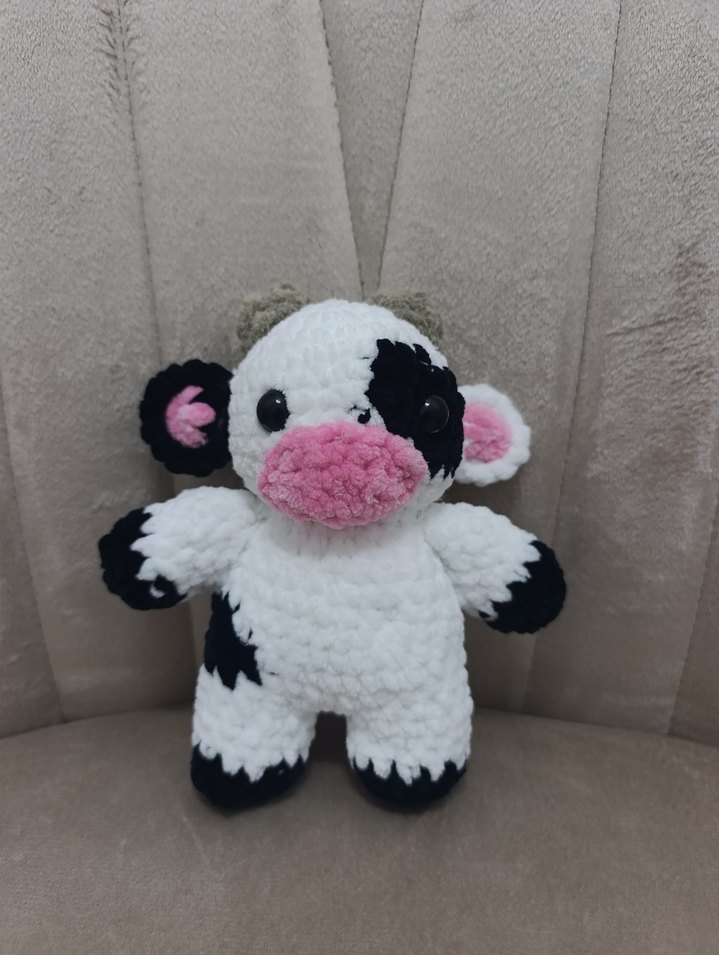 Yumuşak dokulu, siyah beyaz lekeli ve pembe burunlu renkli peluş inek oyuncak. Sarılmak için uygundur.