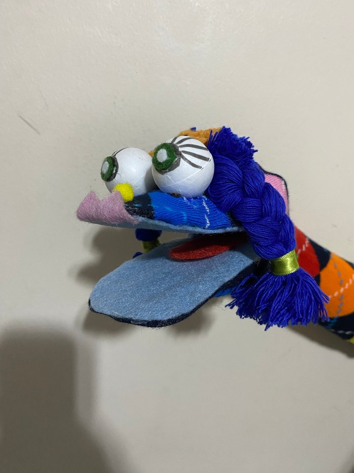 Büyük gözlü ve mavi örgülü saçlı, çok renkli peluş kukla oyuncak. Yumuşak ve eğlenceli tasarım.