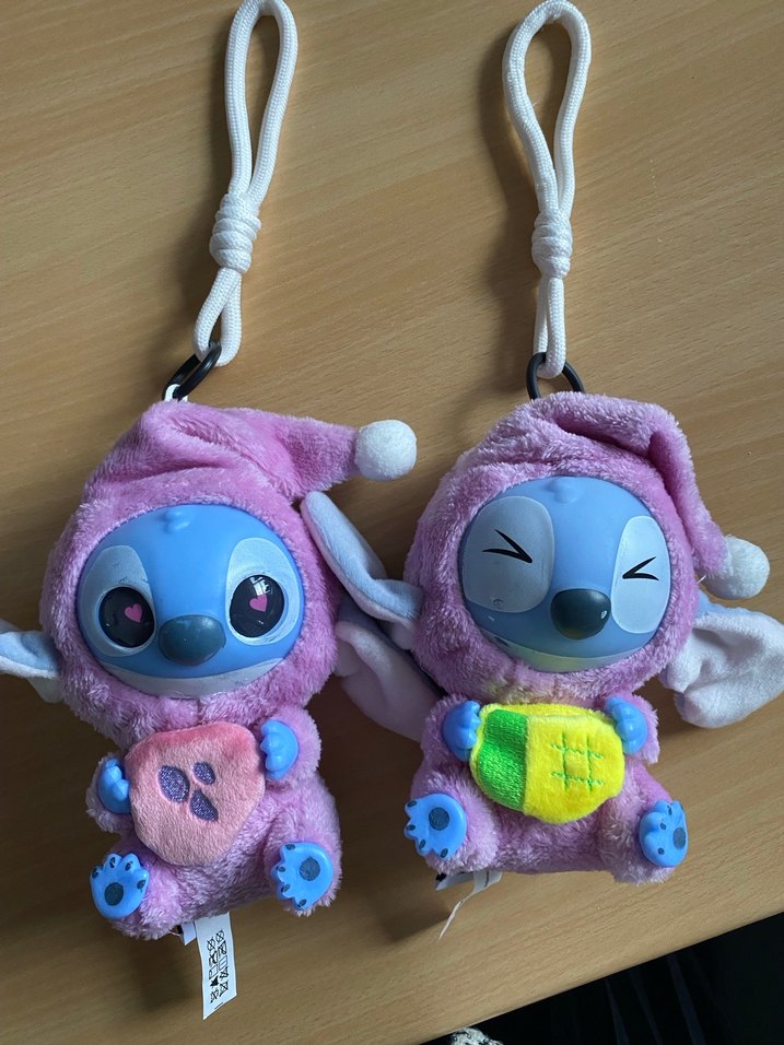 Renkli mor peluş oyuncak anahtarlıklar, sevimli karakterler küçük objeler tutuyor. Yumuşak ve sevimli yüz ifadeleriyle.