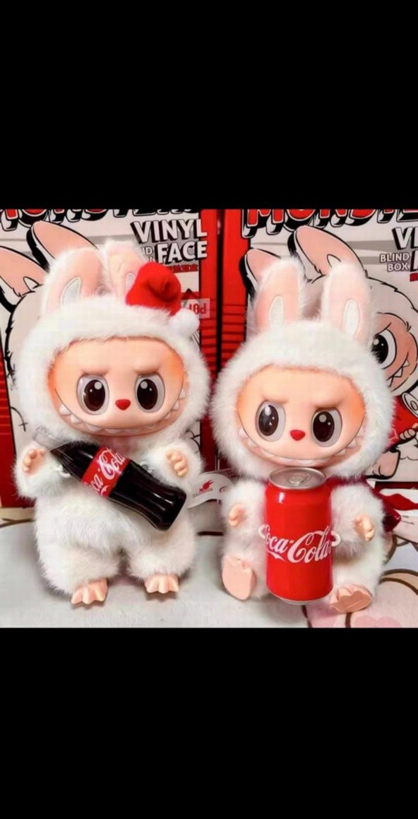 Beyaz tüylü kostüm giymiş, büyük gözlü ve tavşan kulaklı renkli peluş oyuncak. Kırmızı kalp burun ve Coca-Cola kutusu/bardağı tutuyor.