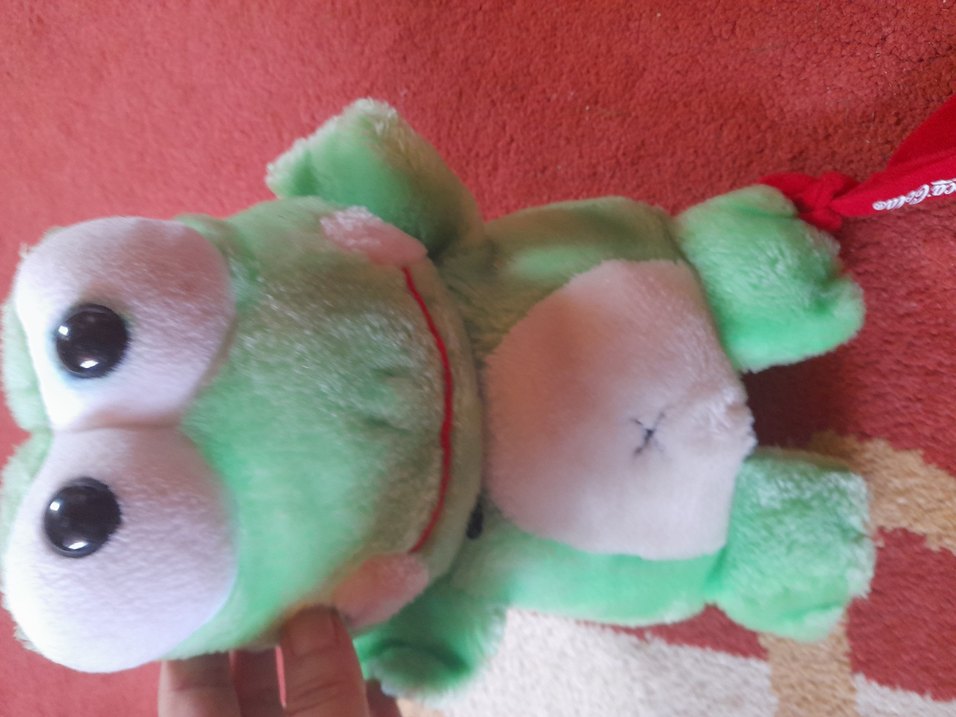 Yumuşak kumaştan yapılmış, renkli ve gülümseyen yüzlü peluş kurbağa oyuncak. Canlı yeşil tonları ve pembe-beyaz detaylar içerir.
