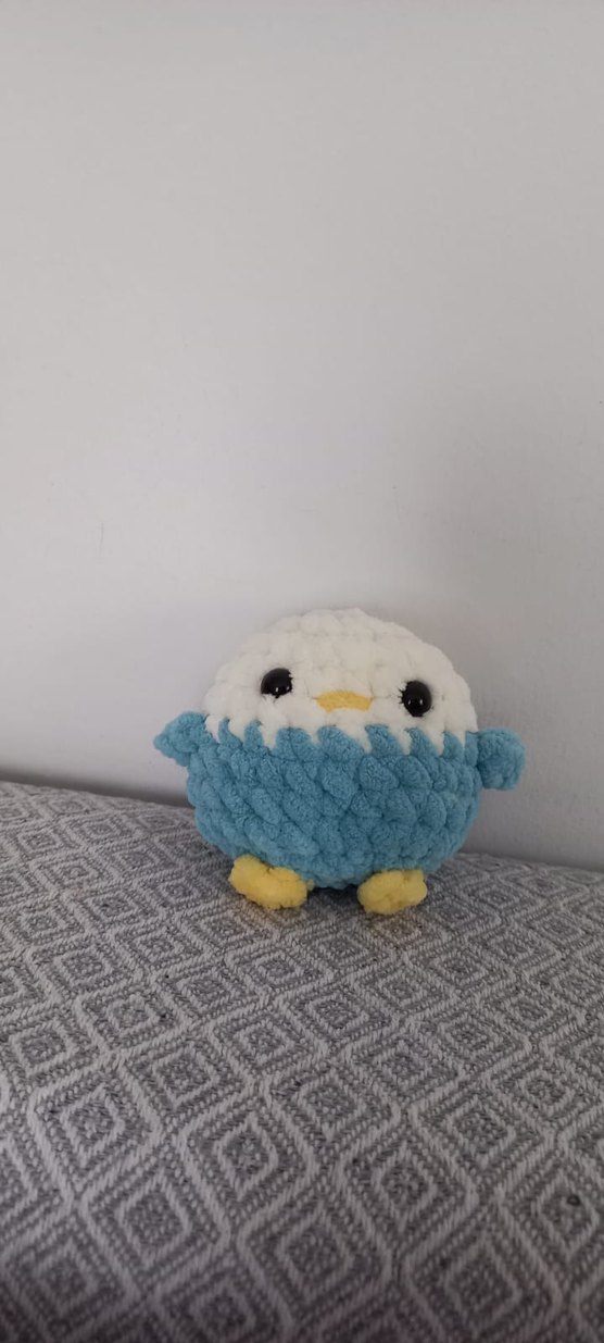 Mavi gövde, beyaz baş ve sarı ayaklara sahip yumuşak ve renkli peluş oyuncak kuş. 10cm