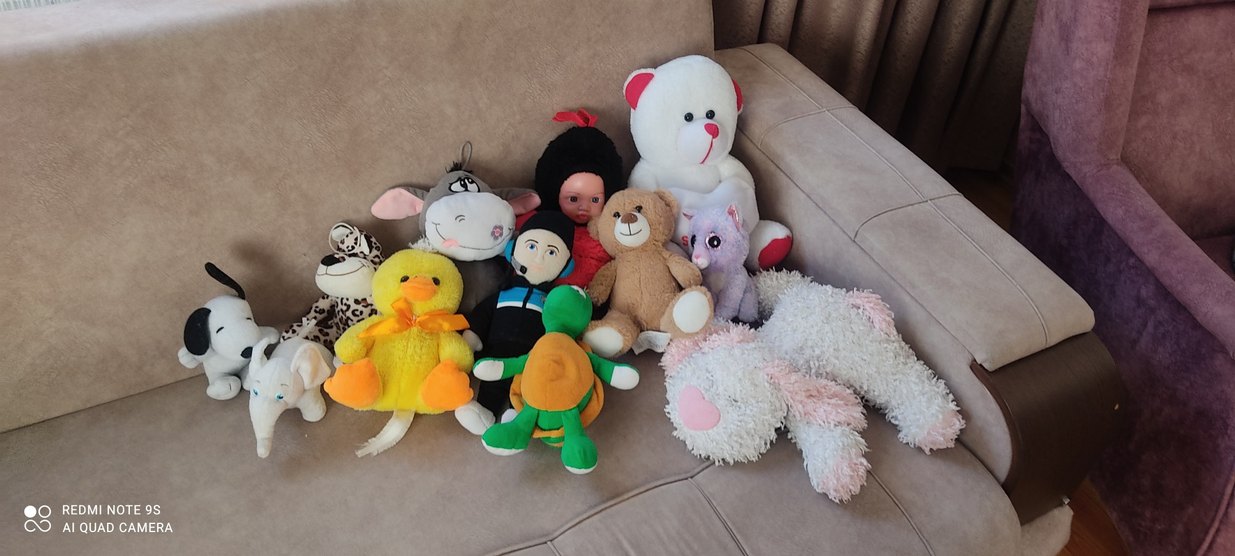 Yumuşak kumaştan çeşitli hayvanlar ve karakterlerden oluşan renkli peluş oyuncak seti. Oyun veya dekorasyon için uygundur.