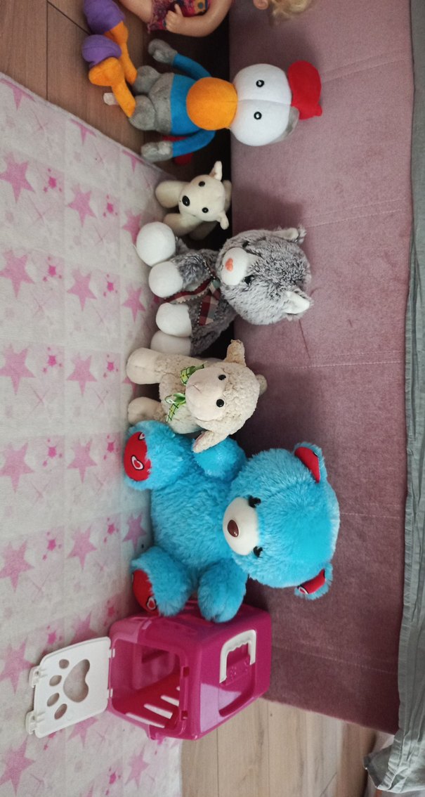 Mavi ayı, kuzu, gri kedi, küçük geyik ve horozdan oluşan renkli peluş oyuncak seti. Yumuşak ve sevimli oyuncaklar.