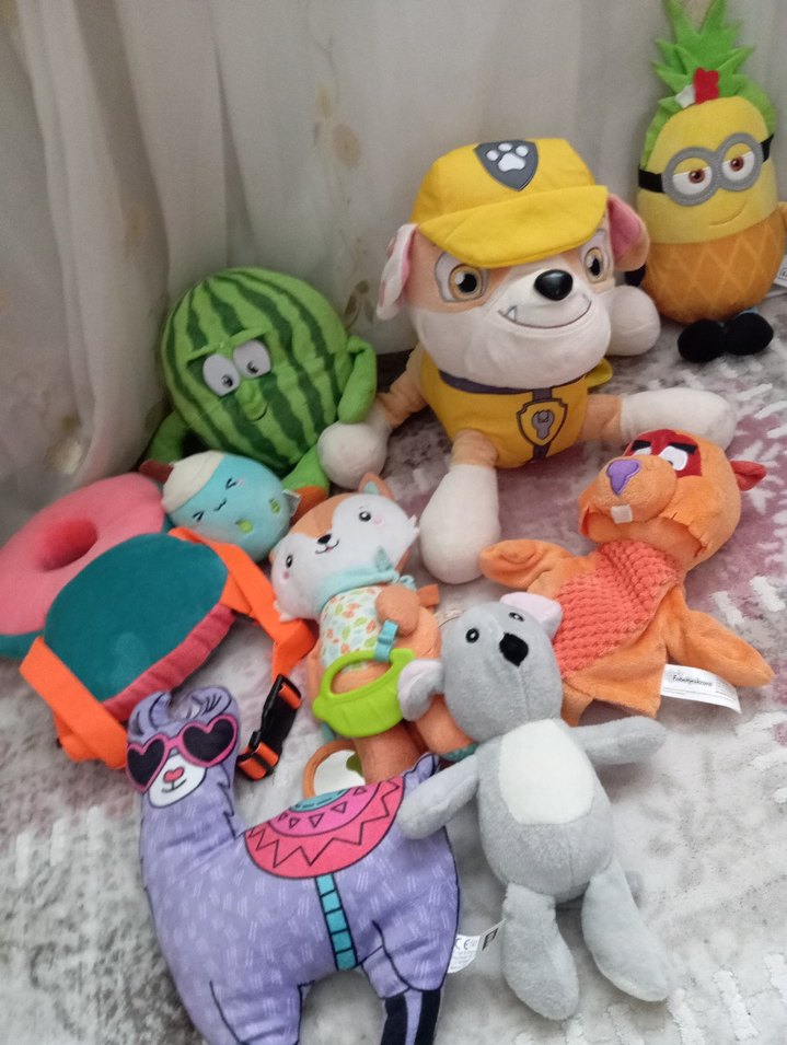 Yumuşak kumaştan yapılmış çeşitli hayvan ve karakter tasarımlarını içeren renkli peluş oyuncak seti. fiyat sorunuz