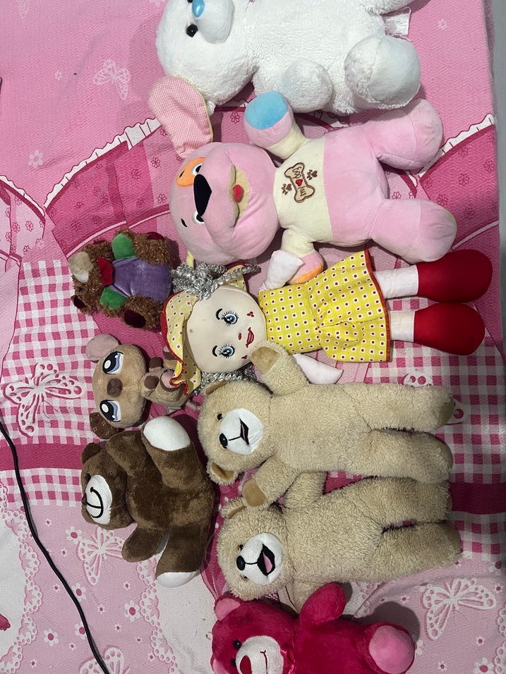 Yumuşak dokulu, renkli ayıcıklar, bebek ve çeşitli hayvanlardan oluşan peluş oyuncak seti. Adet fıyatıdır