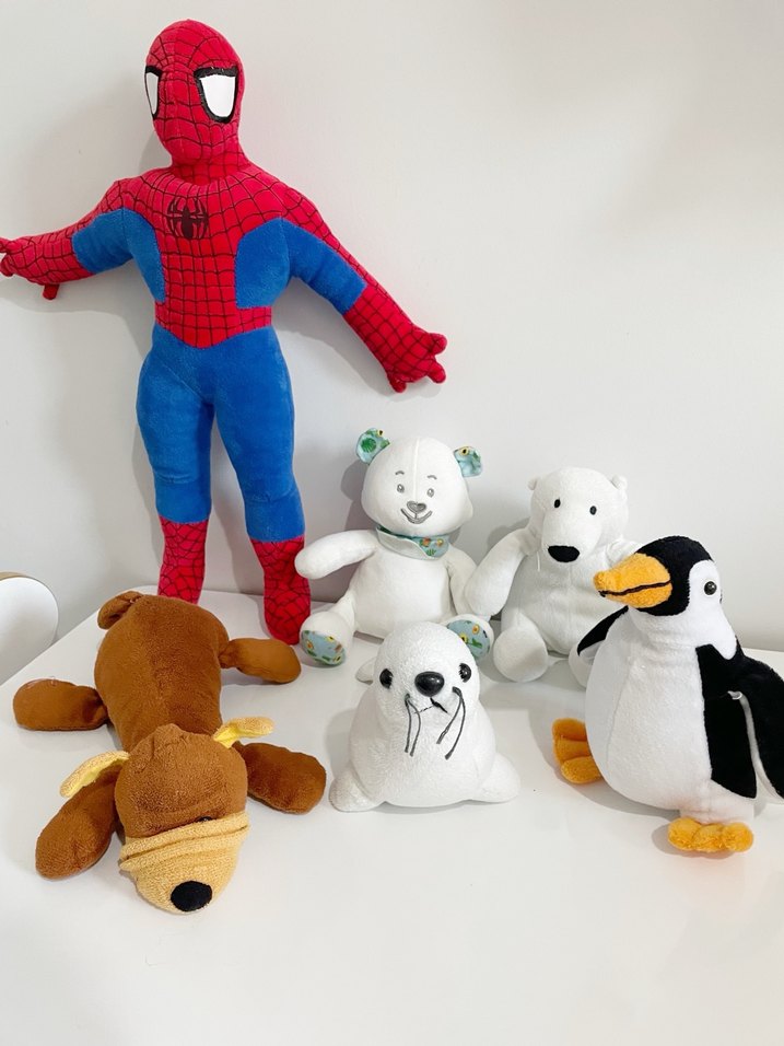 Renkli peluş oyuncak setinde Spider-Man figürü, köpek, penguen, fok ve iki ayı bulunur. Yumuşak ve canlı renkli kumaştan üretilmiştir.