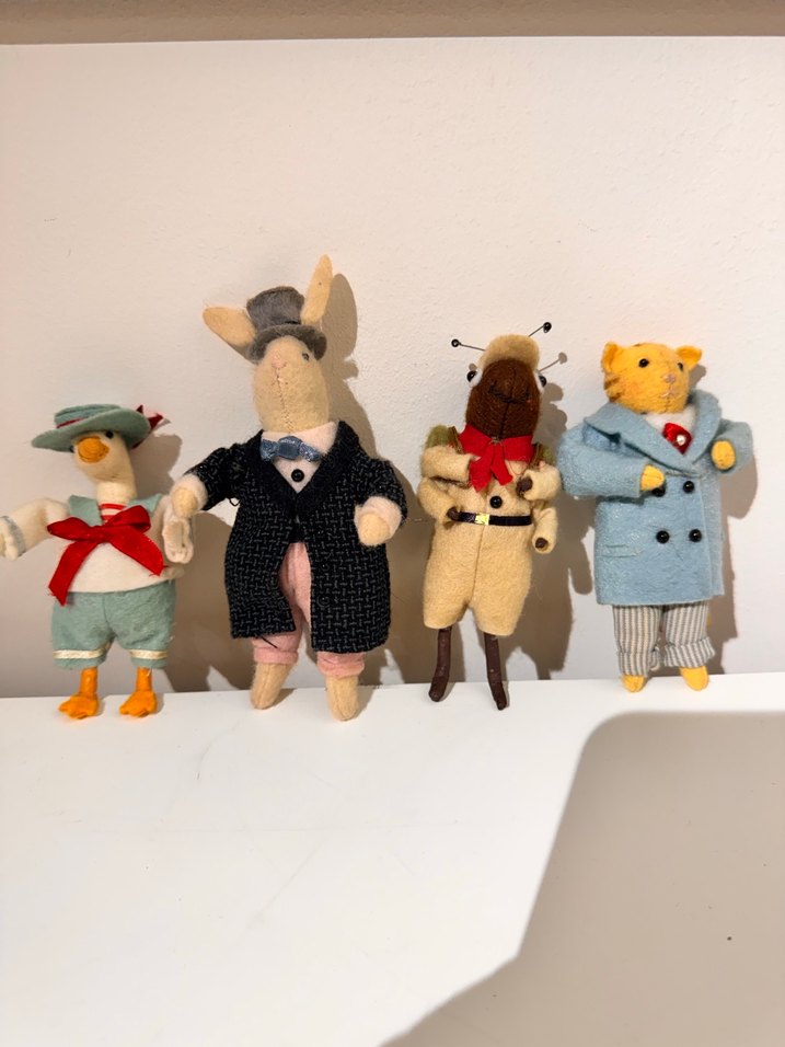 Farklı kıyafetler giymiş dört renkli peluş oyuncak seti. Ördek, fare, böcek ve kaplan figürleri yumuşak dokuludur. Keçeden elde yapılmıştır Avrupa vintage ürün 4 adet fiyatıdır