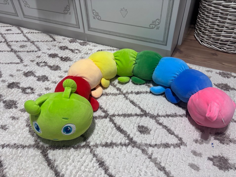 Yumuşak kumaştan, renkli ve çok bölmeli peluş tırtıl oyuncak. Sarılmalık ve sevimli bir arkadaş.