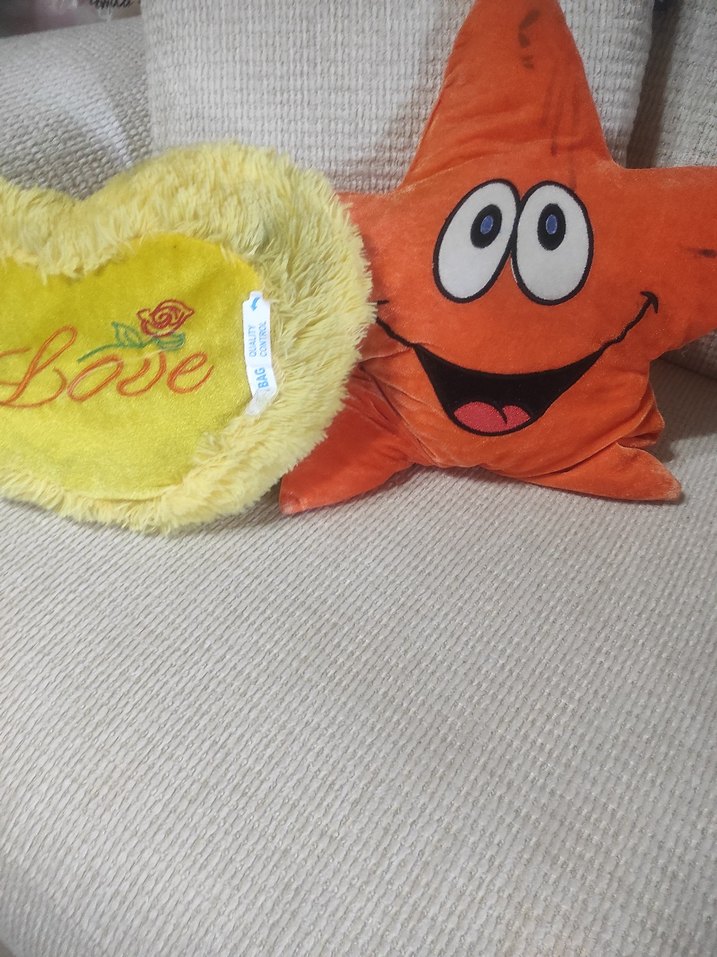 Renkli peluş oyuncak, gülen yüzlü turuncu yıldız ve 'love' nakışlı sarı kalp yastık. Yumuşak ve rahat kumaş. 2 li yastık