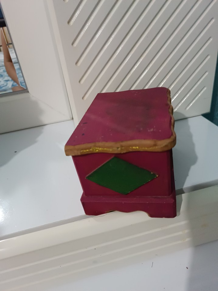 Renkli pembe ahşap sandık, üzerinde yeşil elmas detay ve sağlam yapıya sahip. Pürüzsüz yüzeyi vardır.