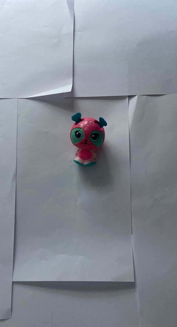 Büyük gözlü, mavi kulaklı, renkli pembe aksiyon figürü. Küçük ve detaylı, koleksiyon veya oyun için uygun.