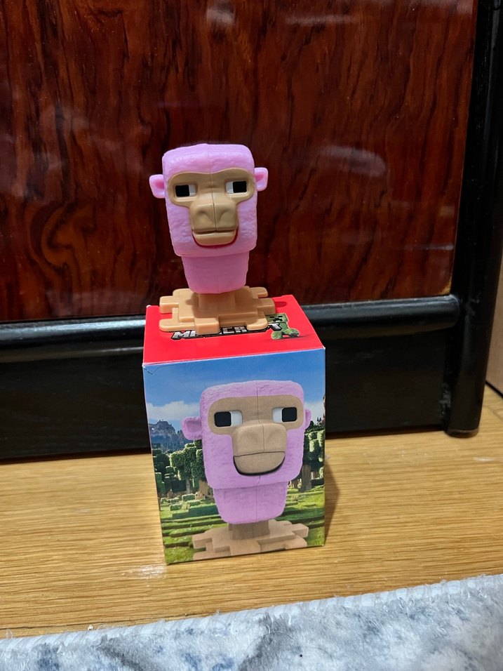 Bloklu ve stilize maymun tasarımlı renkli pembe aksiyon figürü. Aynı görselle basılmış kutu üzerinde duruyor.