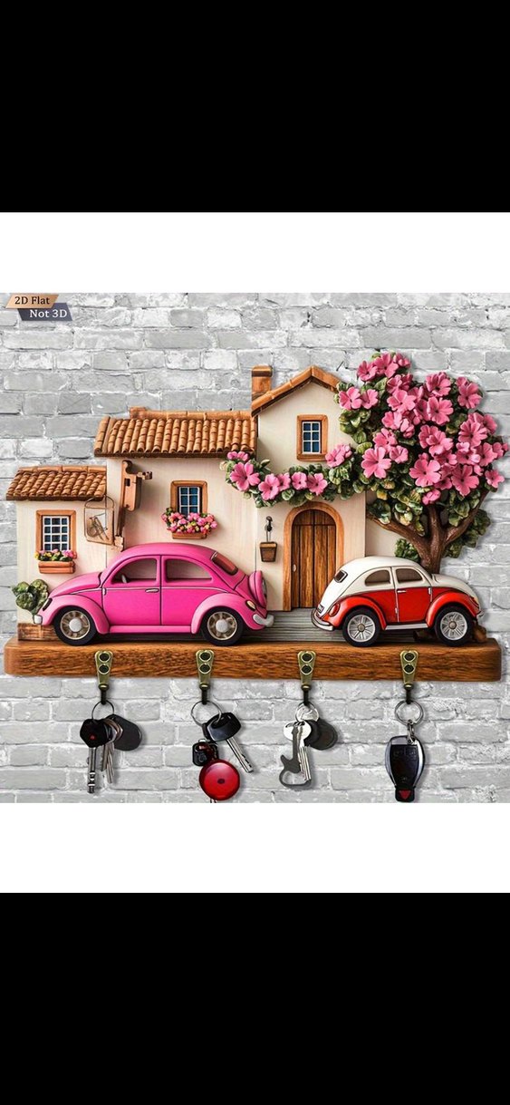 İki vintage araba ve pembe çiçekli ev figürlü renkli anahtarlık, anahtarları düzenli tutmak için tasarlanmıştır.