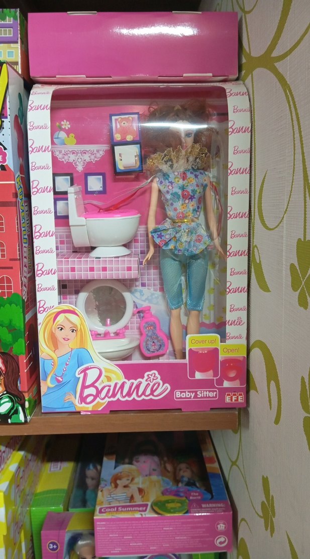 Bannie Baby Sitter bebek, renkli pembe kıyafetli, banyo aksesuarları ile birlikte. Çiçekli bluz ve mavi pantolon içerir.