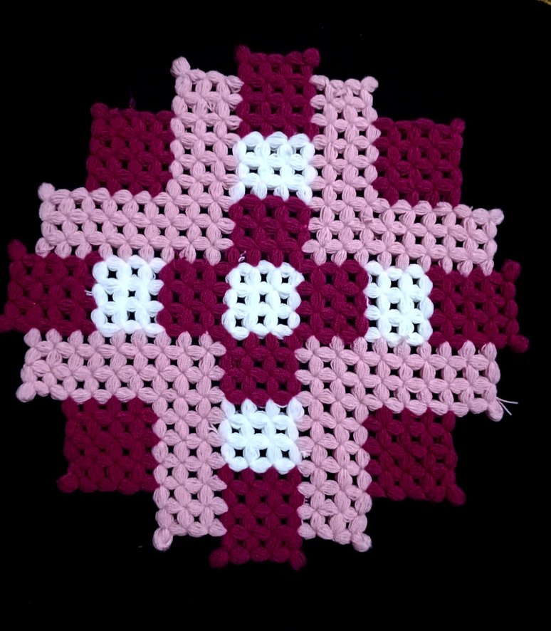 Pembe ve beyaz tonlarında, dokulu örgü tasarımlı renkli banyo süngeri. Nazik temizlik için uygundur.