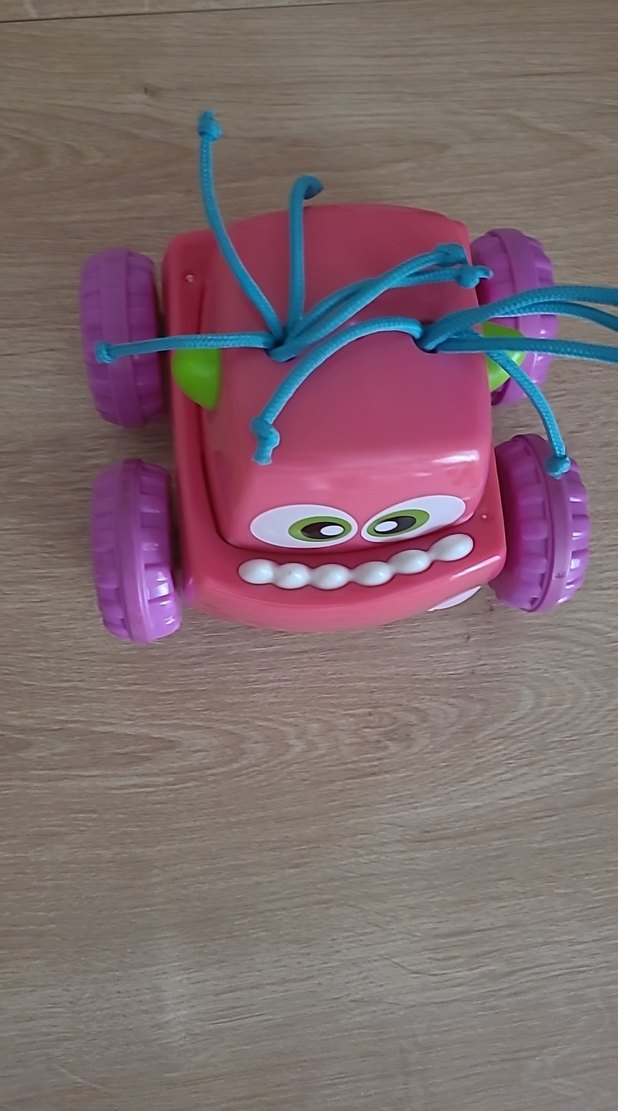 Canlı renklerde, pembe çekmeli oyuncak araba, büyük gözleri ve mor tekerlekleri ile hareketli oyun için tasarlandı.