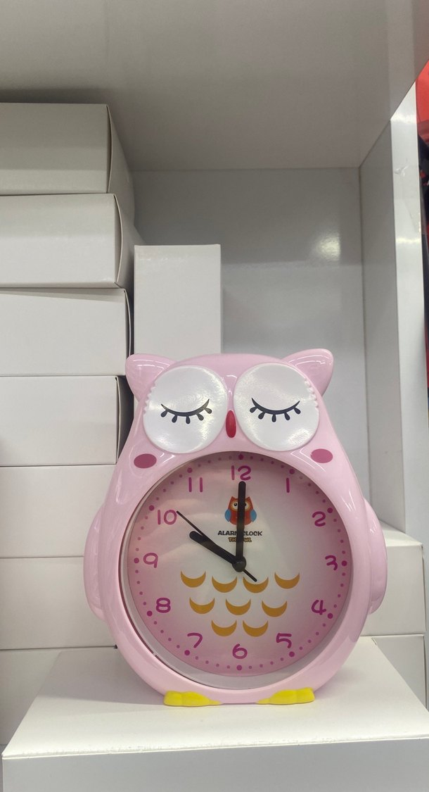 Renkli pembe baykuş şeklinde masa saati, büyük ve net rakamlarla, eğlenceli tasarıma sahip. Kapalı göz detayları bulunur.