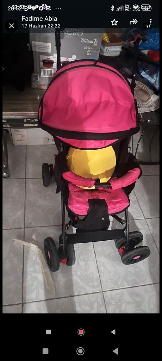 Pembe tentesi ve sarı sırt dayanağı olan renkli bebek arabası, sağlam yapısı ve dört tekerleğiyle kolay kullanım sağlar.