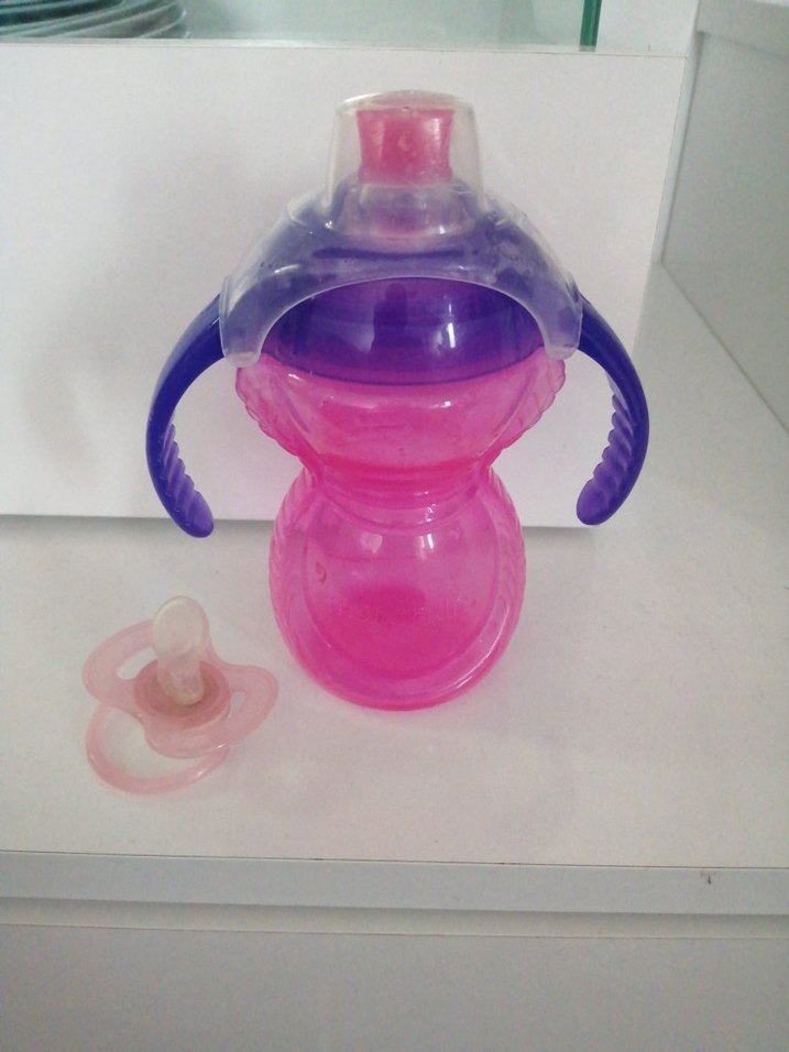 Renkli pembe bebek biberonu, kolay tutulabilen saplara ve şeffaf koruyucu kapağa sahiptir. Ayrıca uyumlu bir emzik içerir.