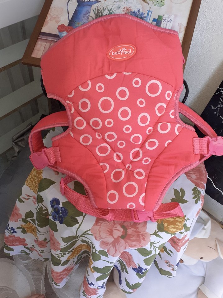 Ayarlanabilir kayışlara ve dairesel desenli yumuşak kumaşa sahip renkli pembe bebek kanguru.