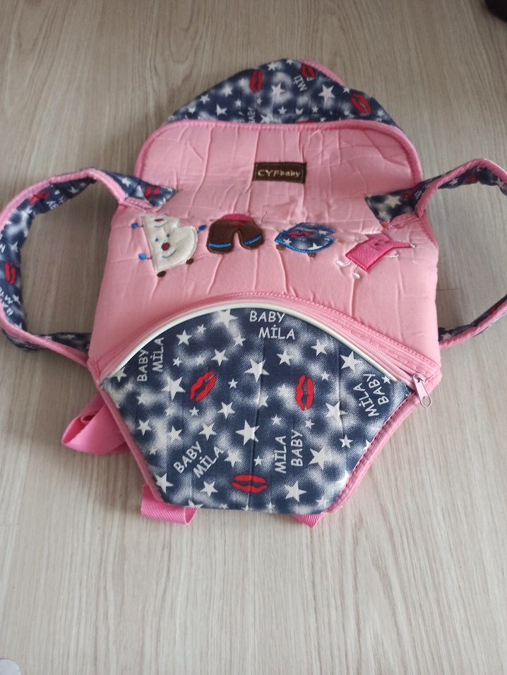 Ayarlanabilir askılı, yumuşak dolgulu renkli pembe bebek kanguru. Üzerinde yıldız ve dudak desenleri ile "MILA BABY" yazısı bulunur. Bebek taşıma için uygundur.