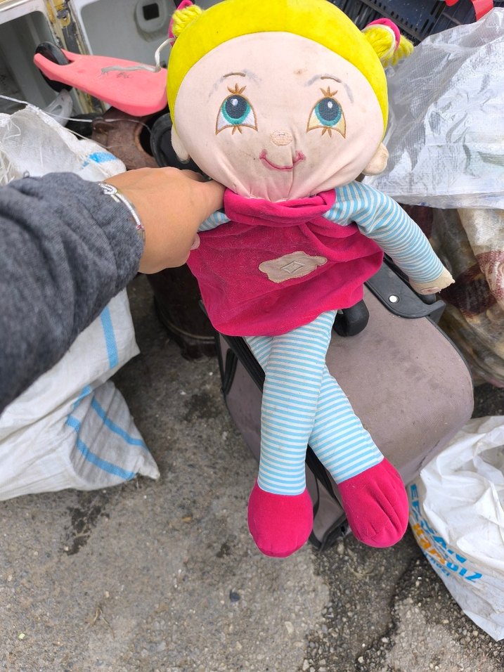 Yumuşak yüzlü, sarı saçlı ve pembe kıyafetli renkli bebek oyuncak. Mavi-beyaz çizgili bacakları ve neşeli ifadesi var.
